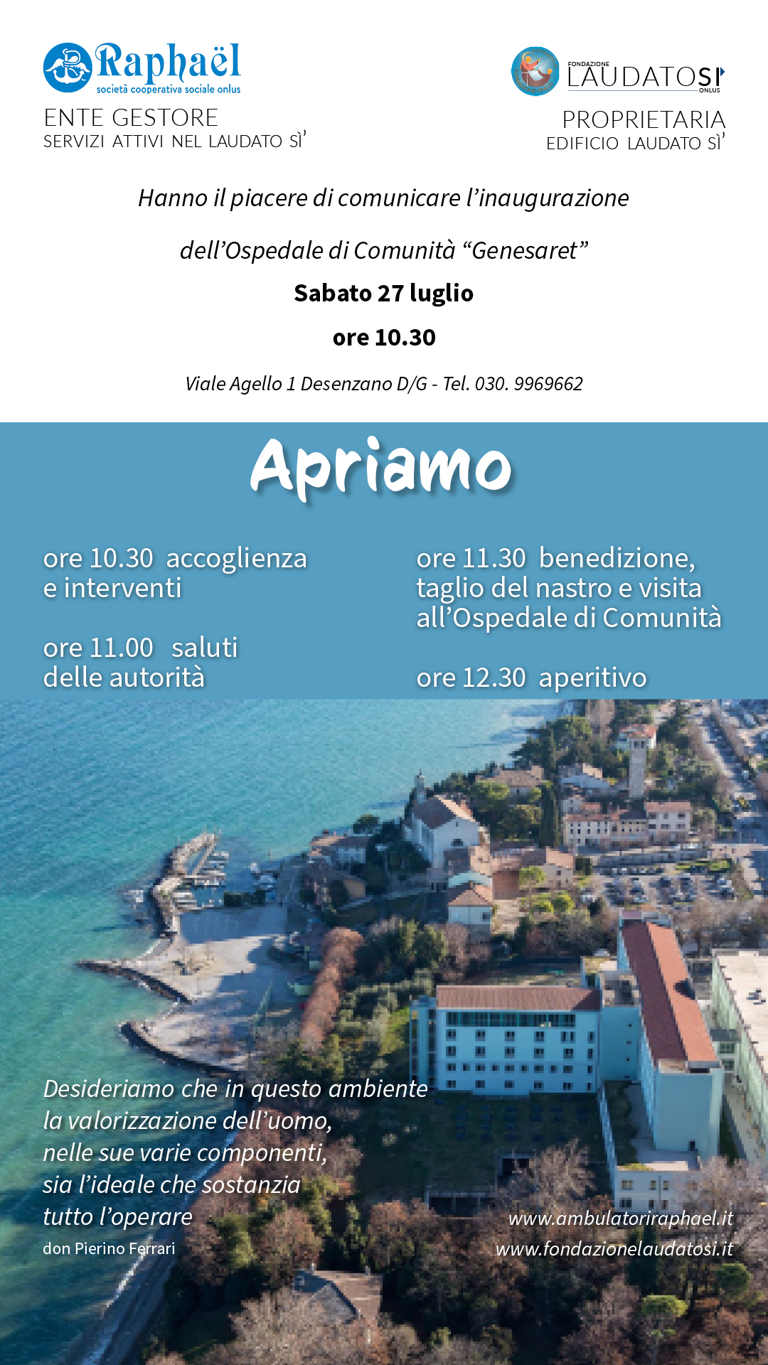 Il 27 luglio fondazione Laudato Sì e cooperativa Raphael inaugureranno il nuovo Ospedale di Comunità presso il Laudato Sì' di Desenzano del Garda.
